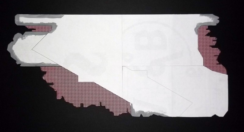 Darüber hinaus wurde das Design der Grundplatte verändert. Die Form blieb gleich, doch das Gittermuster wurde weit über die sichtbaren Grenzen hinaus vergrößert. Sinn und Zweck der Übung ist, dass man so die nächste Ebene quasi freischwebend darüber montieren kann. Indem man die Ränder der Außenhülle, die sich über den gezeichneten Gittern befinden, nicht bündig mit der Grundplatte verklebt, entsteht ein zusätzlicher 3D-Effekt, da man nun hinter die Ränder aufs Gitter blicken kann. Man kann so auch die Ränder nach eigenem Geschmack verformen, nach oben oder unten wellen. Sollte besonders gut wirken, wenn man an der Platte vorbeigeht oder sie schwenkt.