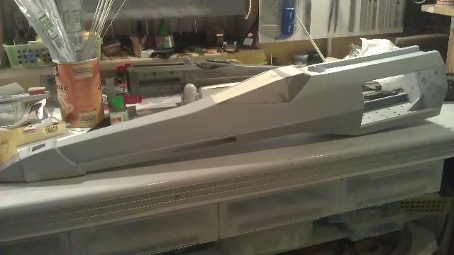 Nach 3 mal Spachteln und ein wenig Schleifarbeit ist der Knick weg. Habe noch ein paar kleine Schönheitsfehler zugespachtelt und verschliffen. Jetzt gehts am Rumpf weiter mit den Lines und den Chips. Werde mich da an dem SS Modell orientieren, welches ich hier habe.  ;)
