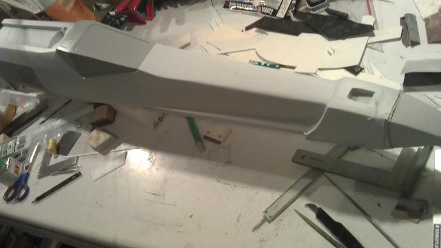 Die Canopy ist bis auf ein paar mm Spachtelstellen fertig und die obere Rumpfhälfte wurde vorne bis zur Nase abgerundet.