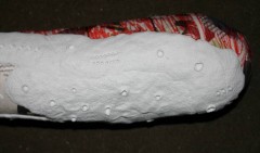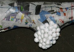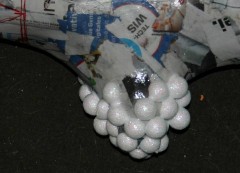 Mithilfe der halbierten Weihnachtskugeln und noch folgender Modellierung werde ich eine Art Brutsack darstellen. Anfangs habe ich überlegt hierfür Kiesel zu nehmen, habe es aber aufgrund des dadurch hinzukommenden Gewichts wieder verworfen. Die Kügelchen sind aus Styropor und ließen sich gut schnibbeln. Geklebt habe ich das ganze mit Bastelkleber.