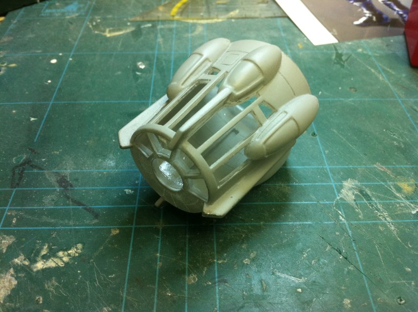 Das Cockpit war zwar in klarem resin gegossen, aber irgendwie zu undurchsichtig. Deshalb Grundierung drauf und ausgefräst: