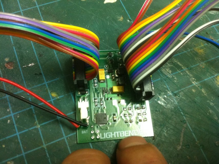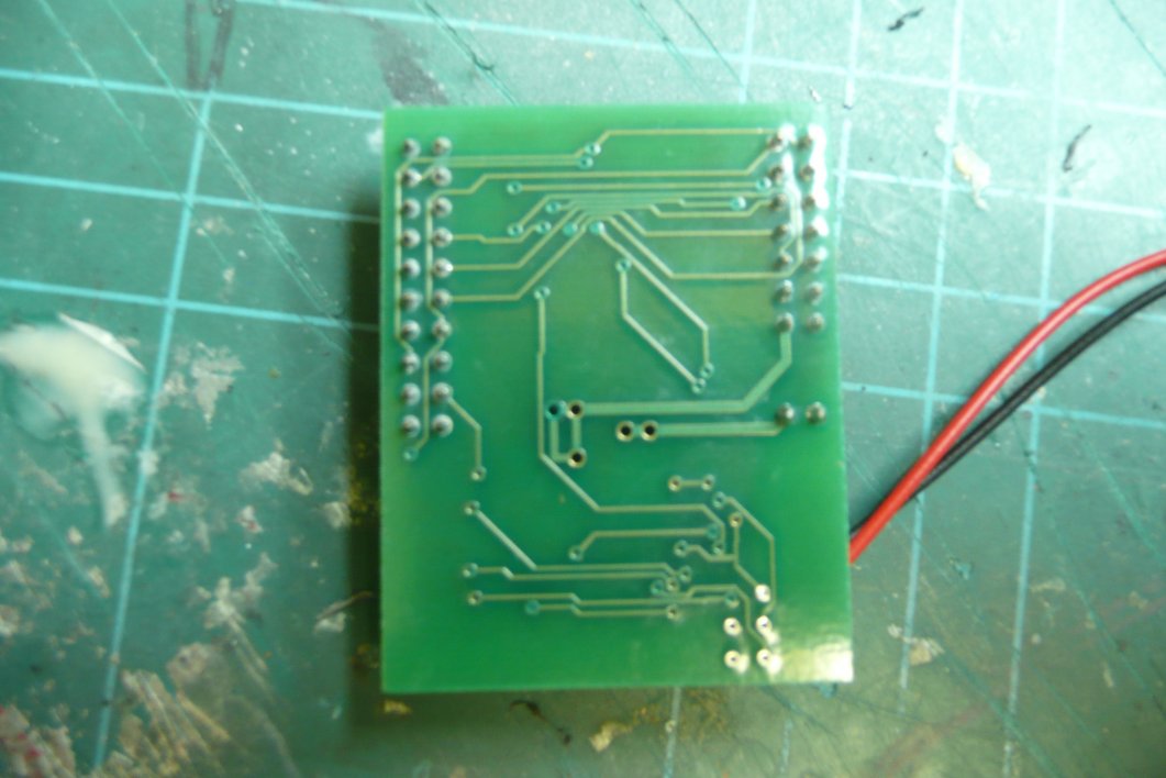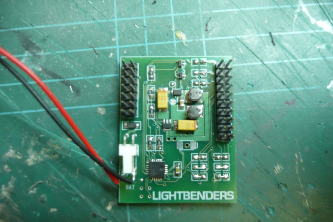 Ein weiteres Problem ist, daß ich das Triebwerk per Schalter abschalten können möchte (was ein Deutsch). Das Modul von Lightbenders hat 8 LEDs für das Triebwerk, die unterschiedlich flickern( rechter Strang), also 8 Zuleitungen. Außerdem sind am gleichen Strang noch zwei LEDs die dauerleuchten. Unten ein Bild der Platine. Kann mir einer von den Elektronikcracks sagen, ob ich das Problem mit EINEM Schalter lösen kann? Wo müsste der hin?