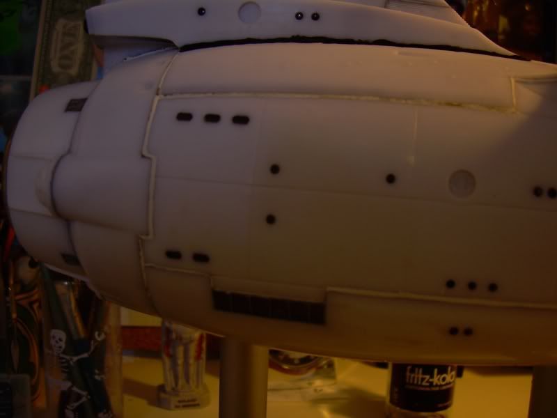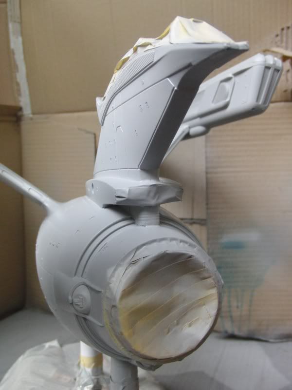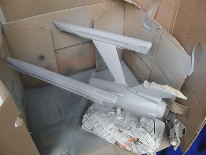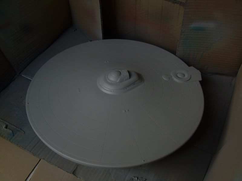 So ich denke das lange Schleifen und Ausbessern hat sich gelohnt, ich habe heute noch eine Schicht Lack draufgesprüht und bin soweit endlich zufrieden  :angel:. Ein zwei kleine Stellen müßen noch verschliffen werden, aber dann kann endlich der weiße Perllack drauf  ;D. Den Discus hab ich auch schon die erste Lackschicht spendiert, da werd ich noch dran müssen, aber da ist nicht so viel auszubessern wie am Rumpf   ;).