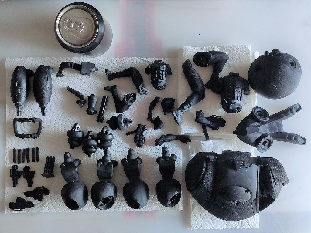 Man könnte auch sauberes Alkohol verwendenund in Wasser aushärten lassen. Dann sollte man nach dem Trocknen die Teile sofort mit ein UV Schutzlack (z.B.: GSI Mr. Super Clear UV-Cut) überziehen. Würde ich nur bei aufwändigere Konturen empfehlen.