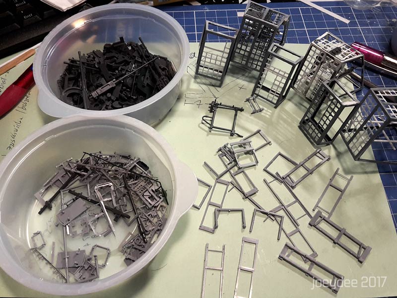 Hatte ich es hier schon erwähnt? Im Original haben die für diese Zwischenböden einfach komplette Rest-Sprues, teilweise mit Panzer-Laufrollen dran, verwendet. Sieht man sogar im Filmbild unten, hier an dem Teil rechts oben (auf ca. 2  Uhr), auch am Schatten. Da ich natürlich keine Mini-Sprues nachscratchen will ;D ist hier wieder etwas Freestyle angesagt.