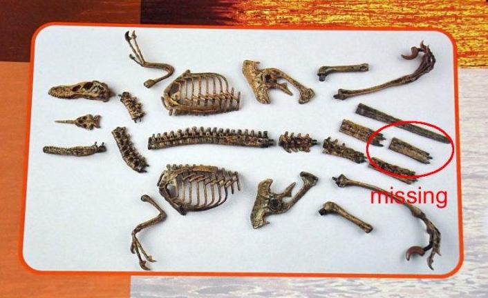 ACHTUNG: Man sollte den Bausatz sofort nach Erhalt inspizieren, denn das QM von Elenco ist manchmal nicht so gut. Bei meiner ersten Bestellung hatte ich zwei rechte Füße, der rechte Oberschenkel fehlte. Und beim Velociraptor fehlte ein Teil des Schwanzes, ein anderes war doppelt vorhanden (s. u.).