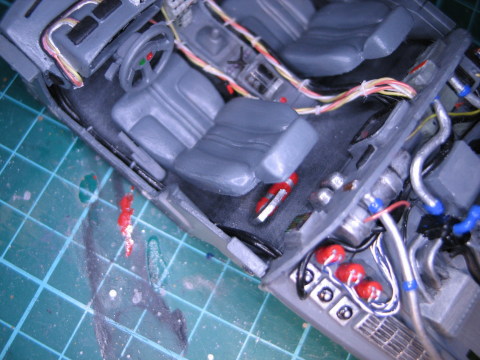 Mit Farbe drauf kamen die Rücklichter mit 5-Minuten-Epoxy in's Heck und rote rechteckige Symbol-LED (für Anzeigen, so um die 50mcd) dahinter