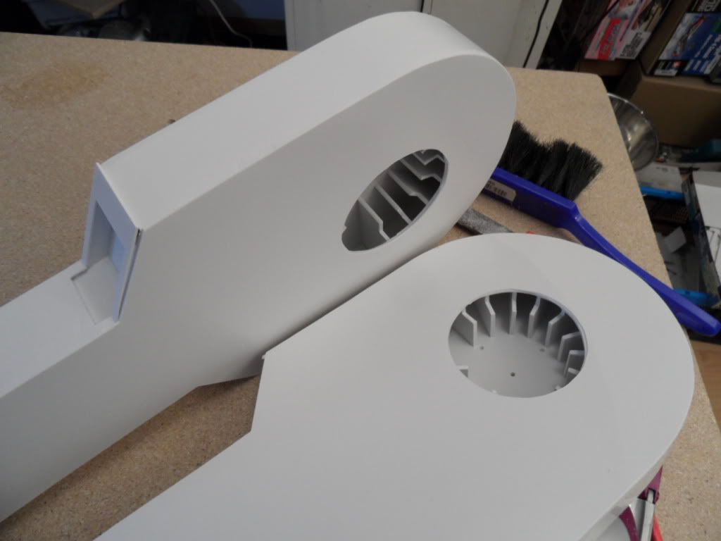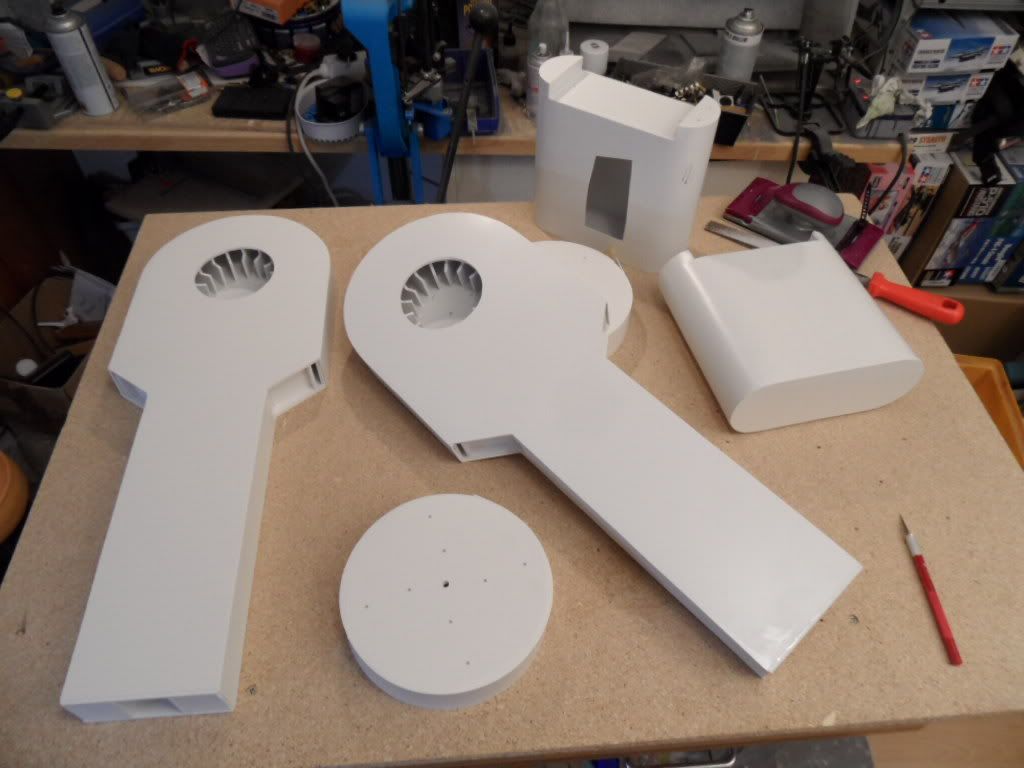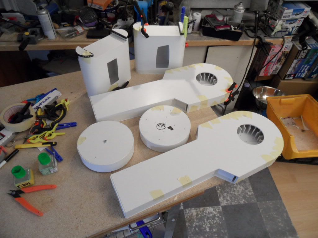 Beine, Batteriebox und Shoulder Hubs (Verbindung Bein/Nody) stehen soweit. Ein wenig Schleifarbeit und vielleicht ein wenig spachteln, aber sonst ganz gut..
