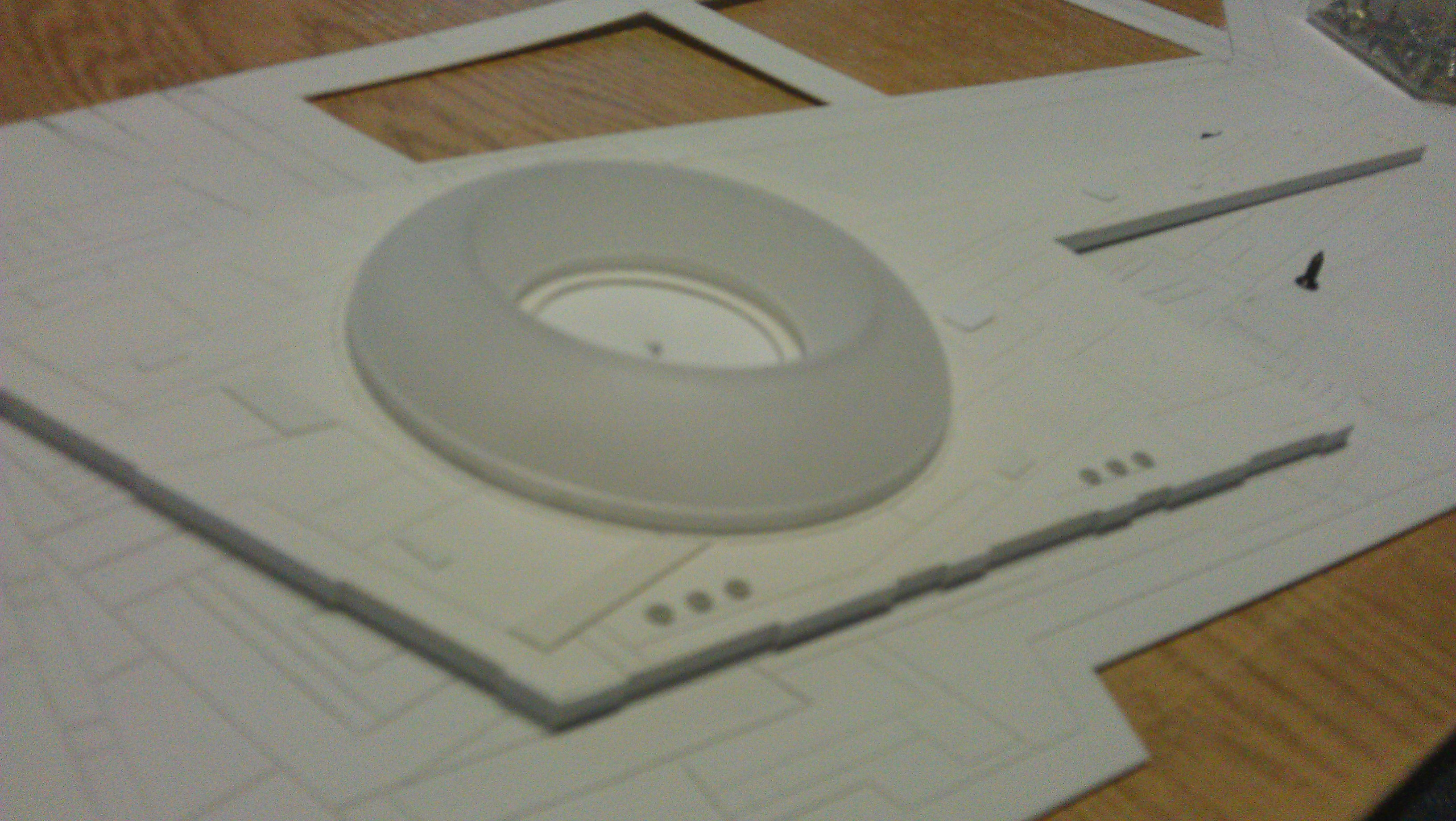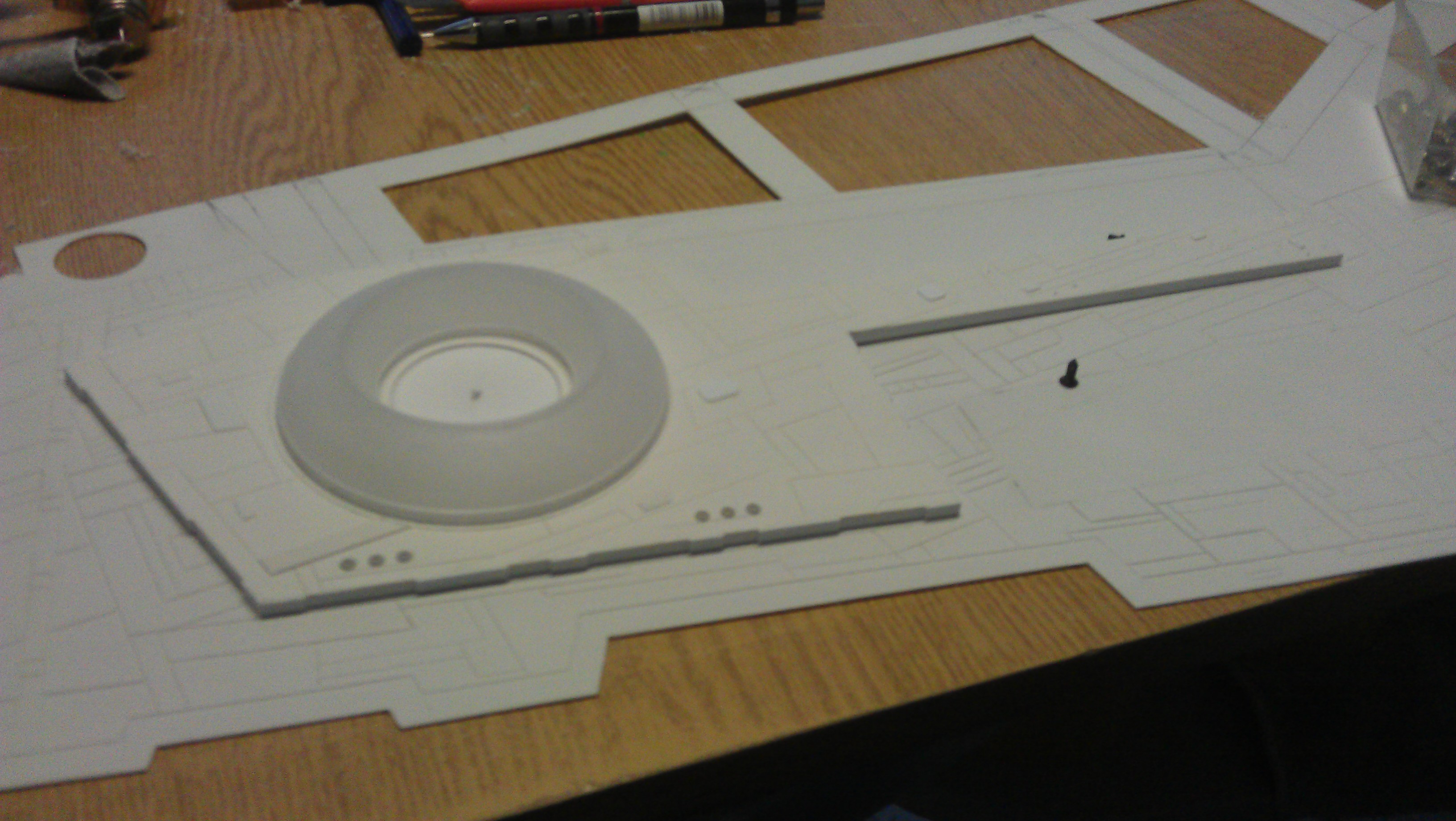 Ich habe mir Gedanken darüber gemacht, wie ich schaffe die Masterteile so zu gestalten, das ich von den Rumpfplatten nicht alle 4 machen muß ( oben 2 unten 2 ). Da auf den unteren Rumpfteilen ein flacher Aufbau mit den Reaktoren und noch der Aufbau mit den Geschütztürmen ist und oben drauf nicht, kam ich gestern Abend auf die Idee diese Teile mit kleinen Schrauben ab - und anmontierbar zu machen. Ich kann dann die Panellines unter den Aufbauten weiter durchziehen und die Rumpfteile für oben und unten nehmen,