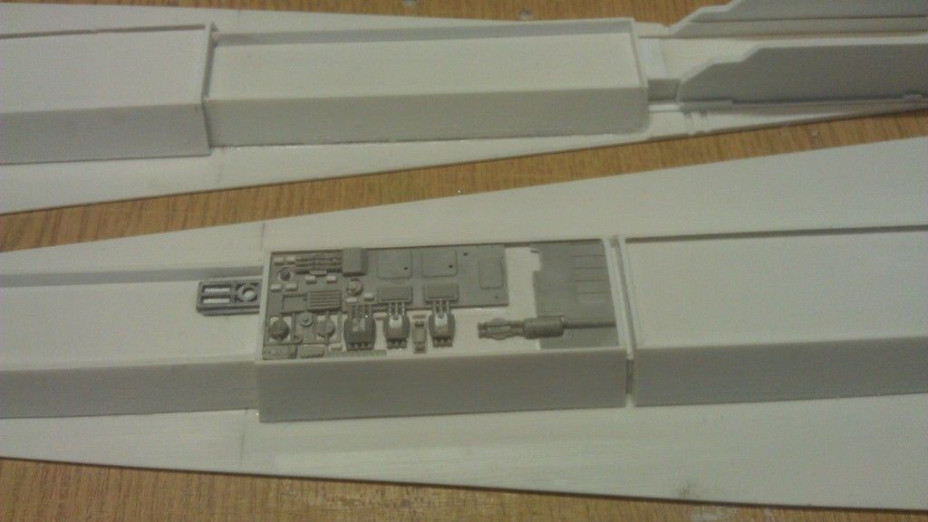 Klaus....Hangarbuchten hat das Teil zu genüge. Eine gaaaanz große unten am Rumpf, eine vorne zwischen den Mandibleseses, vier kleinere am Heck (zwei oben, zwei unten ) und einen großen und kleineren jeweils in den SideWalls.