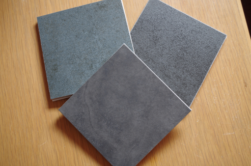 Bei Bauhaus gibt es Fliesenmuster, 15x15cm für 3,99€ mit Porto. Ich habe mir die drei Versionen "Stone Art Smoke Anthracite", "Metallica Ottanio" und "Oxyd Black" bestellt, alle drei sind Feinsteinzeug, geklebt auf eine mit Informationen bedruckte Kunststoffplatte.