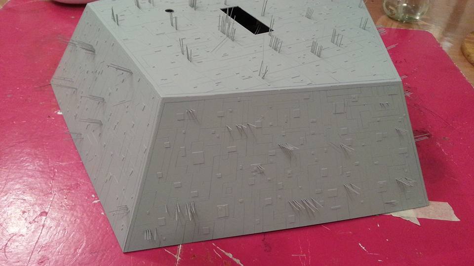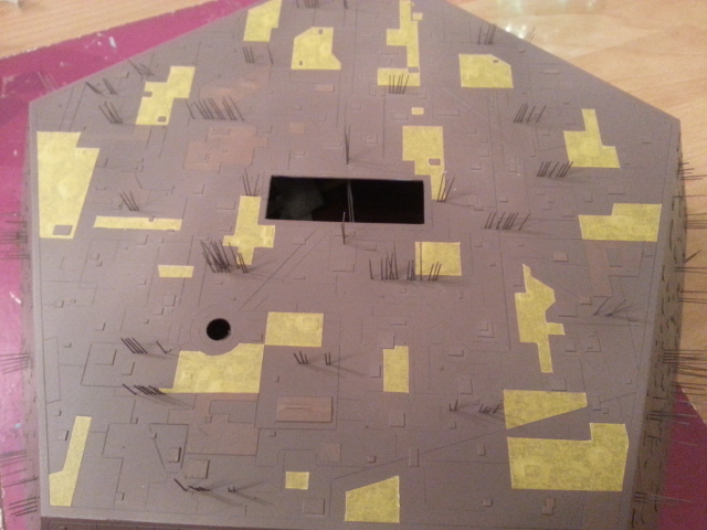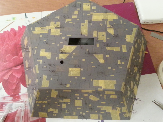 Konsequenterweise hätte ich die aufgesetzten Plättchen auch verzerrt darstellen müssen. Das hätte aber den Aufwand erheblich vergrößert, da die Form der Verzerrung von dem exakten Anlegeort auf der Seitenwand abhängig ist. Hieße also für jedes einzelne Teil: Ort festlegen, Verzerrung bestimmen, DANN das Plättchen ausschneiden.
