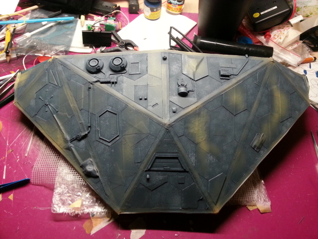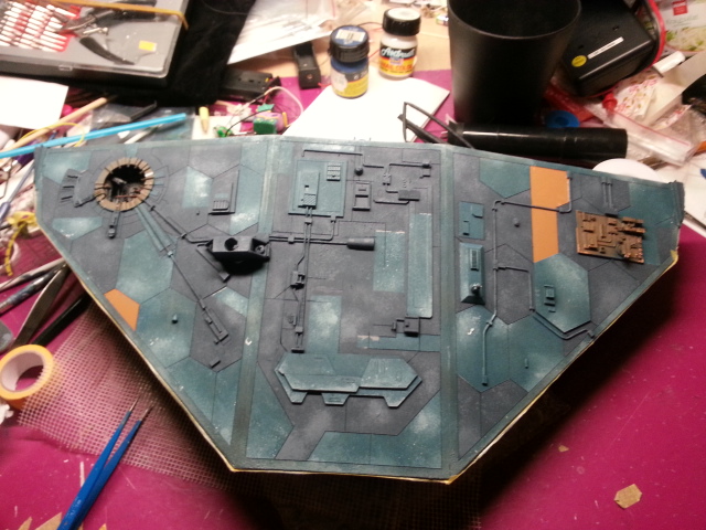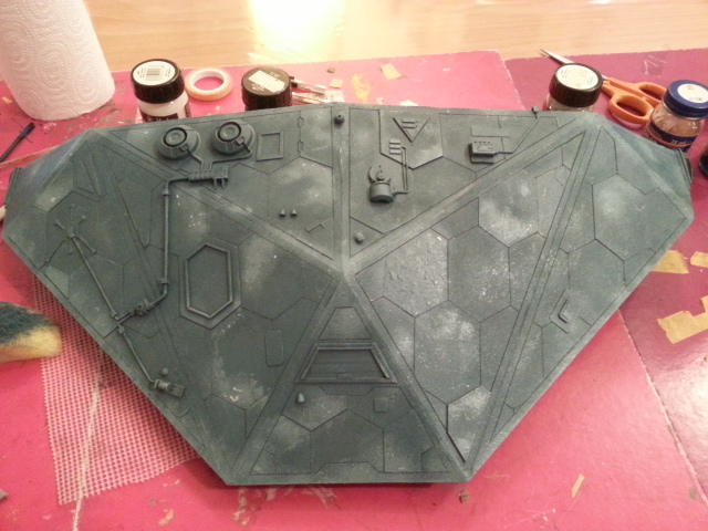 Einige Paneele werden noch in einem anderen Blauton hervorgehoben und ggf. alles nochmal blaugrau übernebelt. Mal sehen, wie das wirkt, wenn die Lackabplatzer hervorgearbeitet sind.