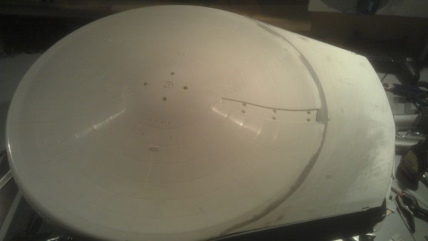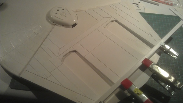 Habe die Umrandung mit den Fenstern am oberen Diskusteil angeklebt......so eine Schweinerei die Nummern so zu verstecken  :cussing:. Der untere Diskus wird nun angepasst und das ganze wird mit Tape zusammen geheftet. Notwendig ist diese Aktion um die genaue Höhe der Seitenwände des Hecks zu ermitteln.