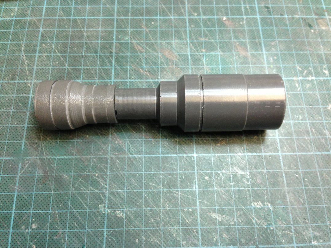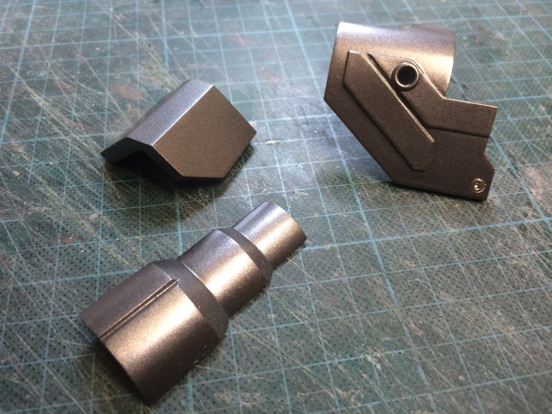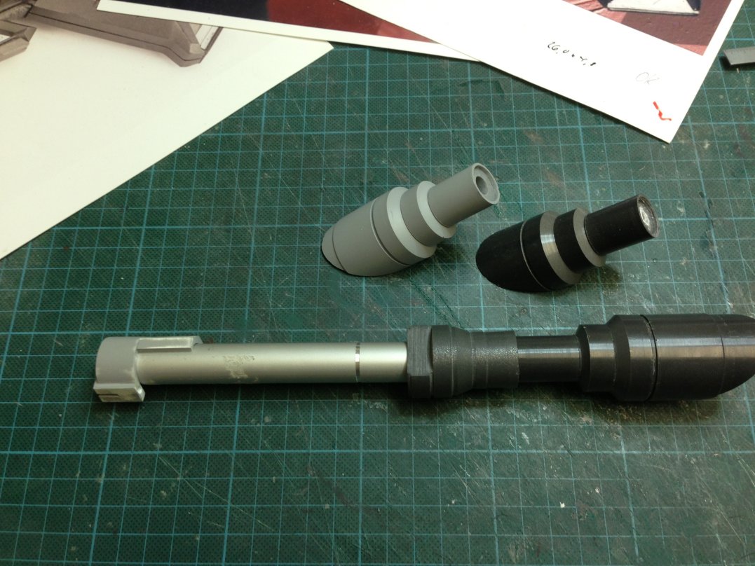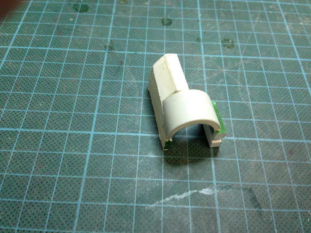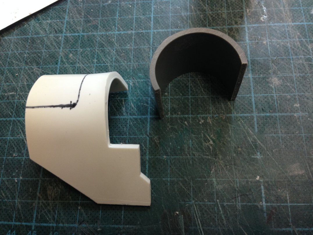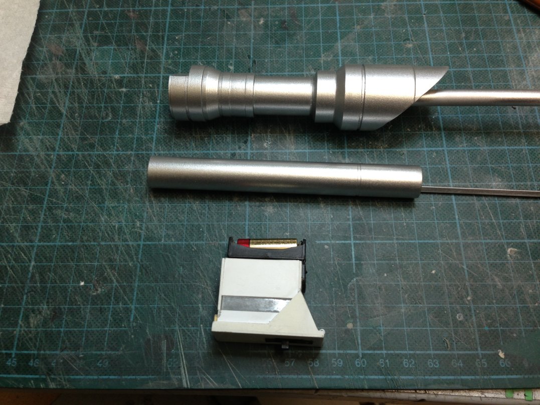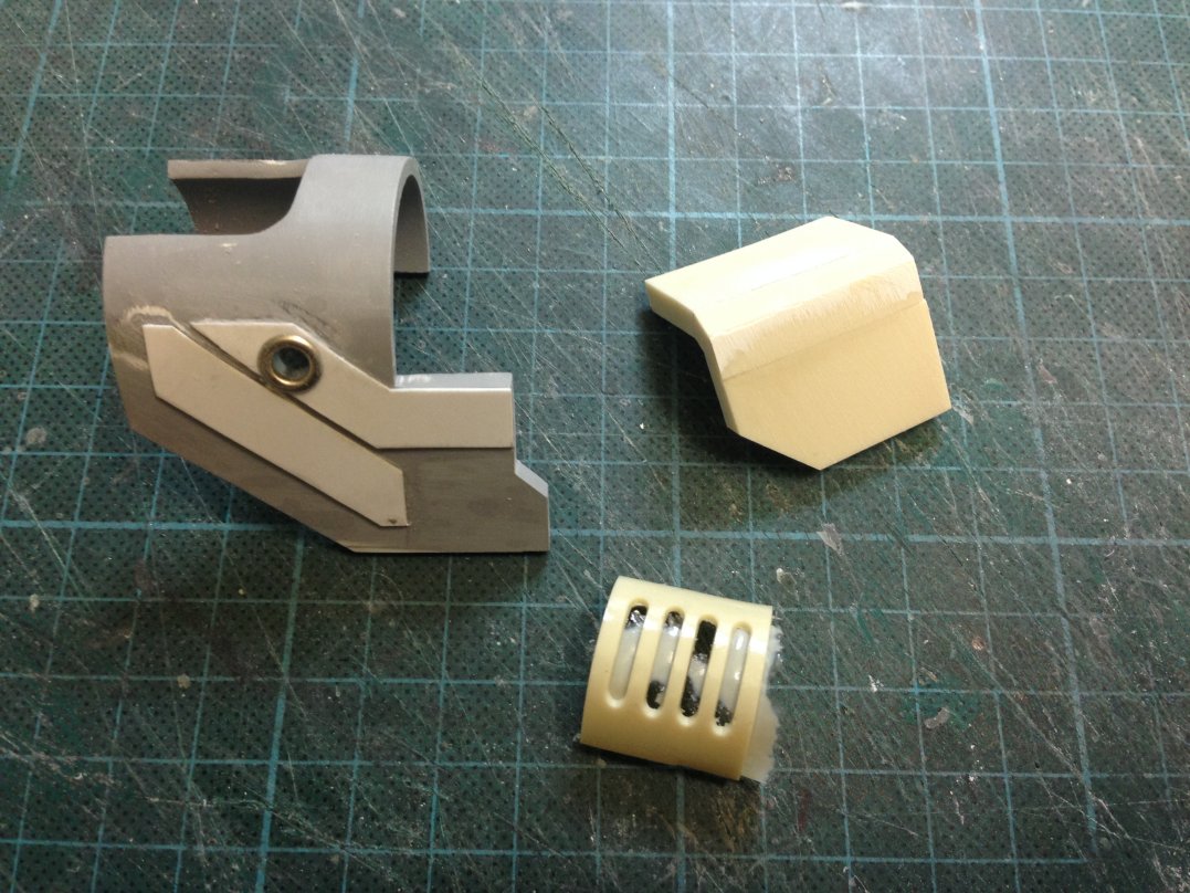 Also hab ich ein Rohr mit dem passenden Durchmesser aufgetrieben und in Form geschnitten. Leider lässt sich PP nicht vernünftig kleben. Also mit Hilfe eines Lötkolbens mit der PS Platte verschweisst und zusätzlich nach groben Anschleifen mit einer Lage Superkleber verklebt. Nach dem Grundieren zeigte sich das nächste Problem. Die PS Plättchen die ich aufgeklebt hatte lösten sich mitsamt der Grundierung (Tamiya) vom PP. Letzendlich habe ich das dann mit Polysilgrundierung speziell für PP gelöst.
