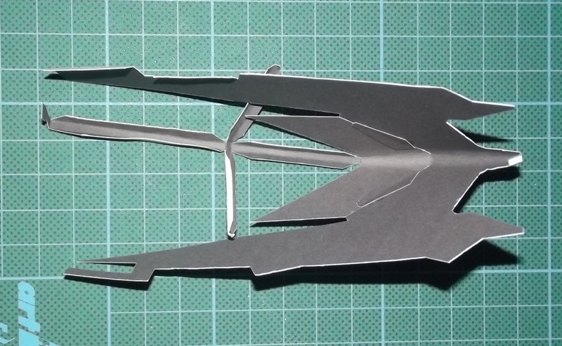Das aufgefaltete Teil ist ziemlich komplex. Ich empfehle daher, es Schritt für Schritt zusammenzubauen. Zuerst sollten die Ober- und Unterseiten der Flügel mit den beigefügten Klebelaschen Nr. 330 & 331 zusammengeklebt werden.